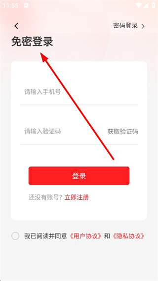 3、選擇免密登錄,需輸入手機號、驗證碼,勾選同意用戶協議和隱私協議后登錄,也可選擇密碼登錄,為用戶提供多樣登錄方式。
