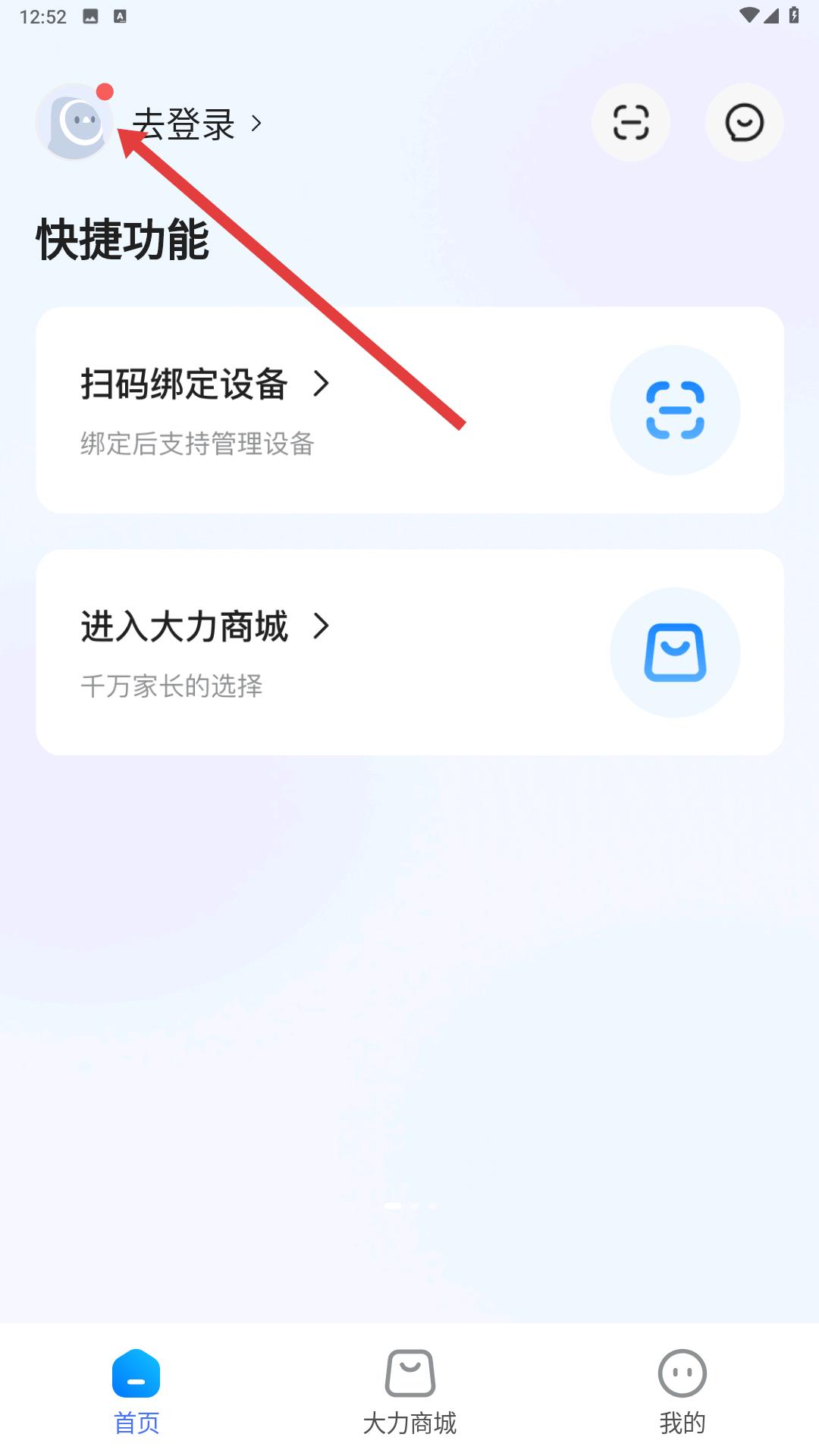 3、進入首頁后,能看到快捷功能等板塊,若要體驗完整功能,點擊左上角去登錄。