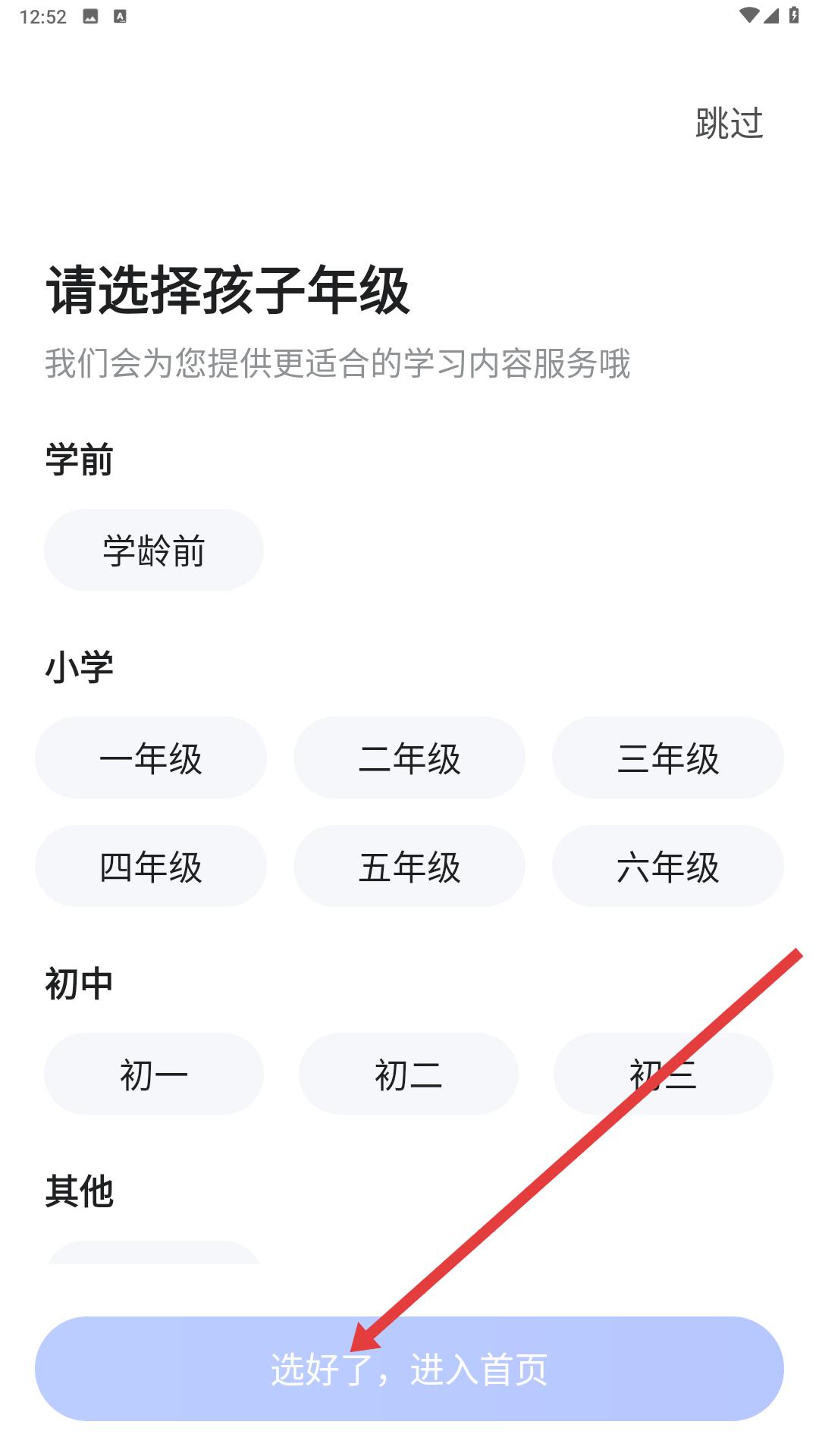 2、接著進入選擇孩子年級的頁面,有學前、小學、初中等不同學段及對應年級選項,選擇好后點擊選好了,進入首頁。