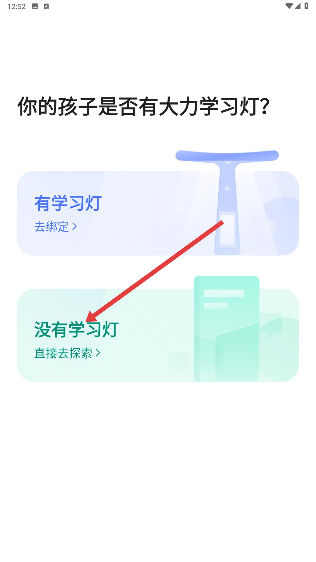 1、進入應用后,首先會看到你的孩子是否有大力學習燈的問題,可根據實際情況選擇有學習燈去綁定或沒有學習燈直接去探索。