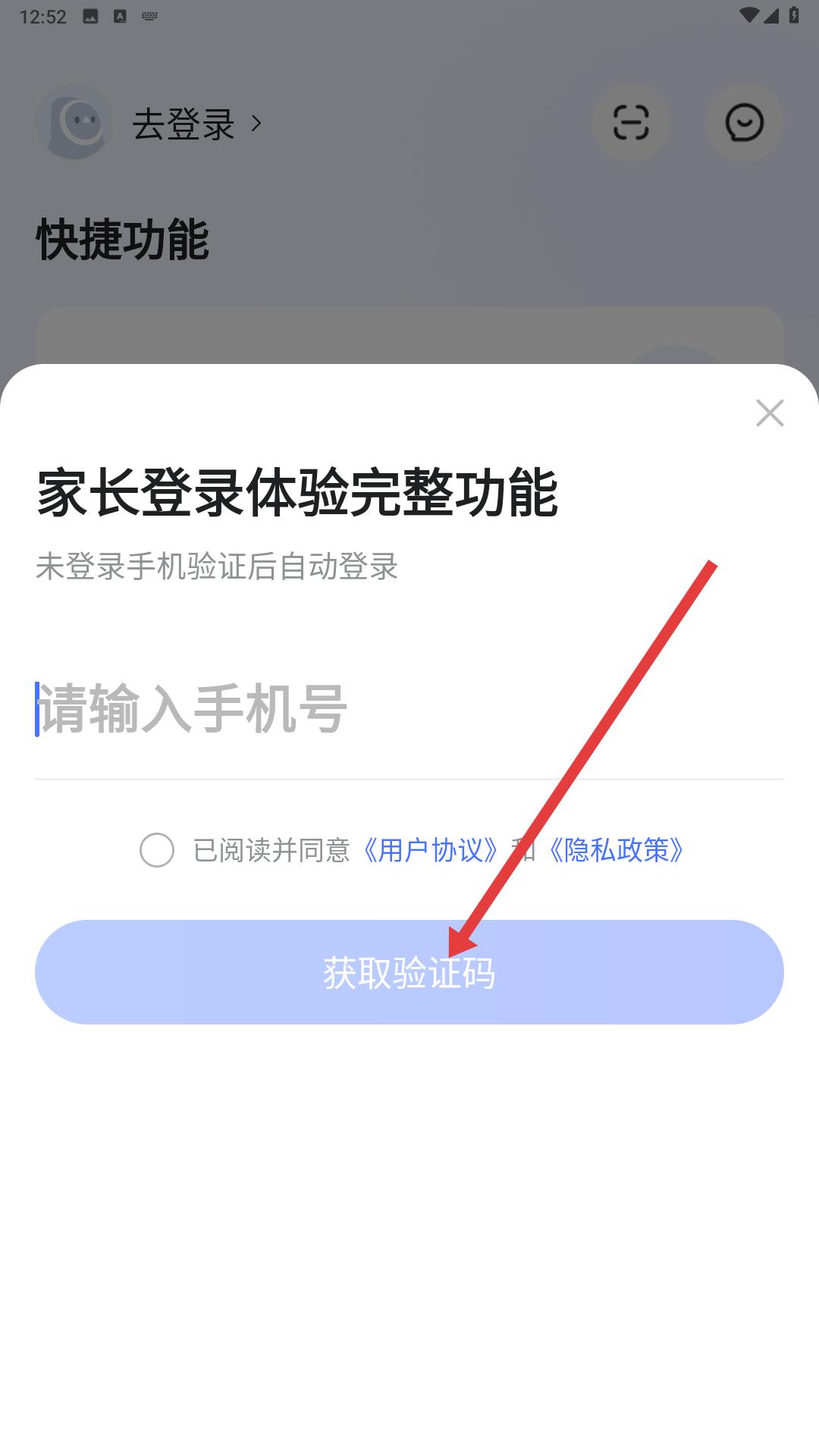 4、家長登錄體驗完整功能的彈窗中,輸入手機號,勾選已閱讀并同意用戶協議和隱私政策,然后點擊獲取驗證碼,后續輸入驗證碼即可完成登錄。