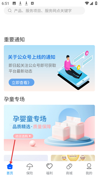 1、首頁有搜索功能,展示公眾號上線通知和孕嬰童專場,提供平臺動態和商品選購入口,助力用戶獲取信息和購物。