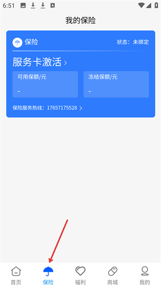 2、保險頁可看我的保險狀態,進行服務卡激活,了解保額情況,還有保險服務熱線,方便用戶管理保險業務。