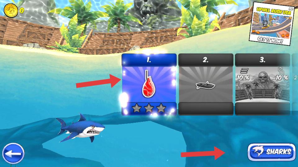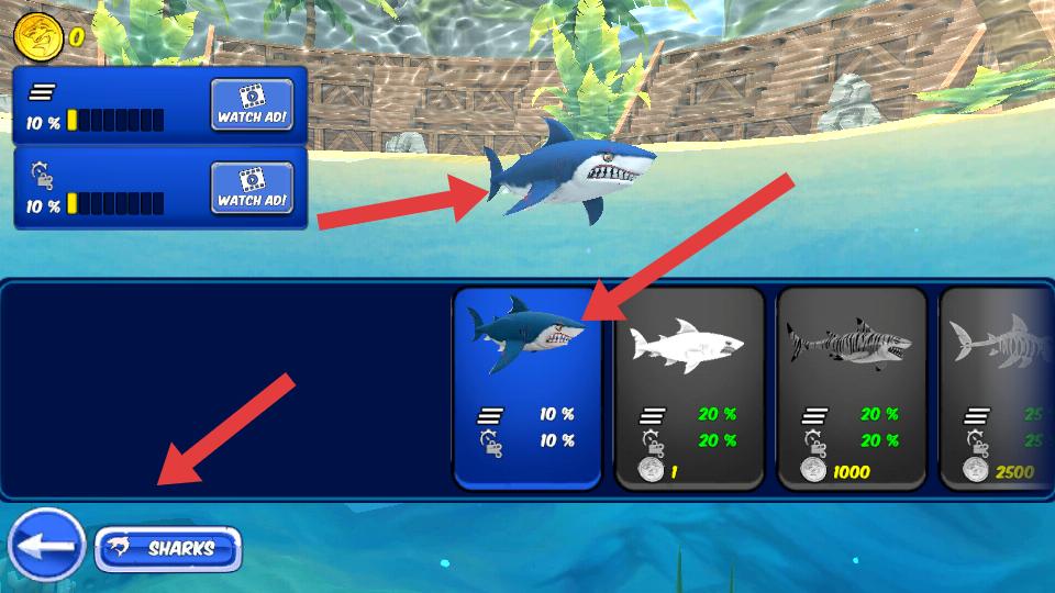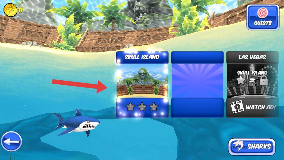 3、在關卡選擇界面,選好關卡后,可查看鯊魚選項,挑選操控的鯊魚,為開展鯊魚表演做準備。