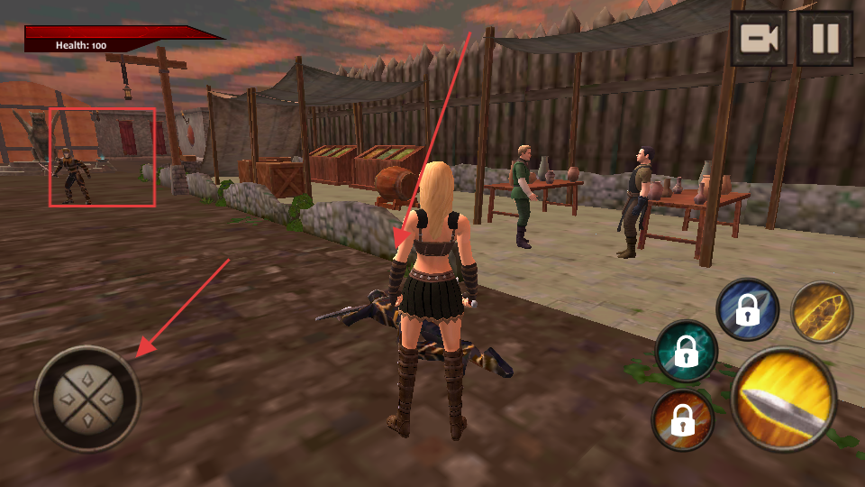 2、操控角色在市場里移動,留意周圍出現的敵人,調整角色位置,等靠近敵人時就準備發起攻擊,同時關注自身血量,保障戰斗安全。
