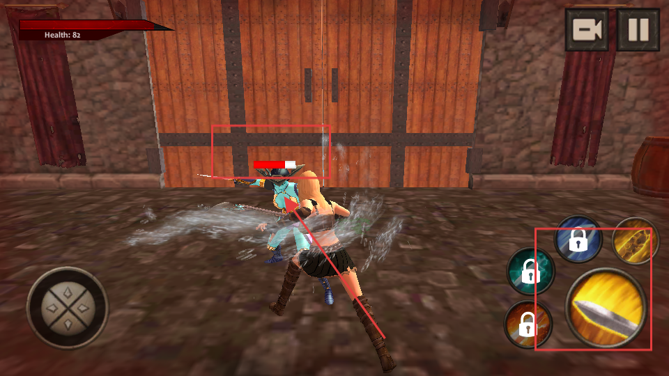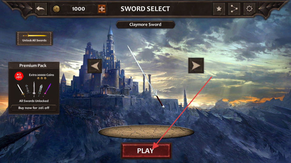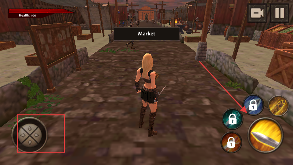 1、進入選劍界面,選好大劍后點擊開始按鈕,進入城堡外的市場場景,左側搖桿能控制角色移動,右側有技能按鈕,先熟悉操作方式。