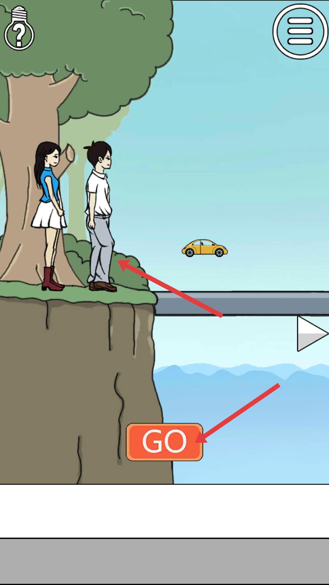 3、第一關場景觀察到人物站在懸崖邊,下方有GO按鈕,點擊觸發相關事件,推進拆散戀人的進程。