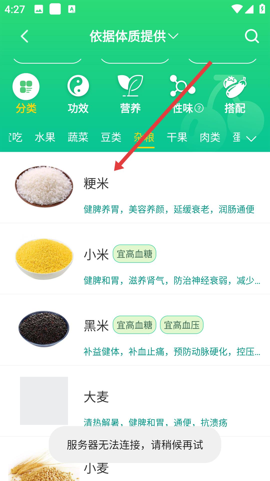 3、切換到雜糧類別,找到粳米選項,點擊進入可查看其健脾養胃等功效介紹。