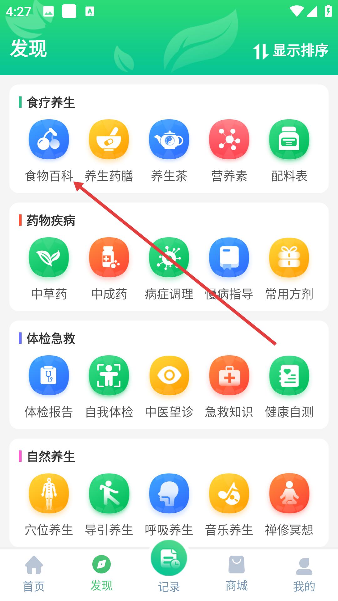 1、進入APP發現頁面,在食療養生板塊點擊食物百科,可瀏覽養生藥膳、養生茶等多個分類入口。
