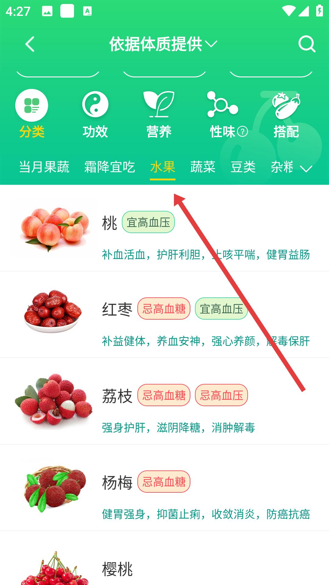 2、進入食物百科頁面,可依據體質提供的分類,選擇水果類別,查看桃、紅棗、荔枝等水果的功效及適宜人群。