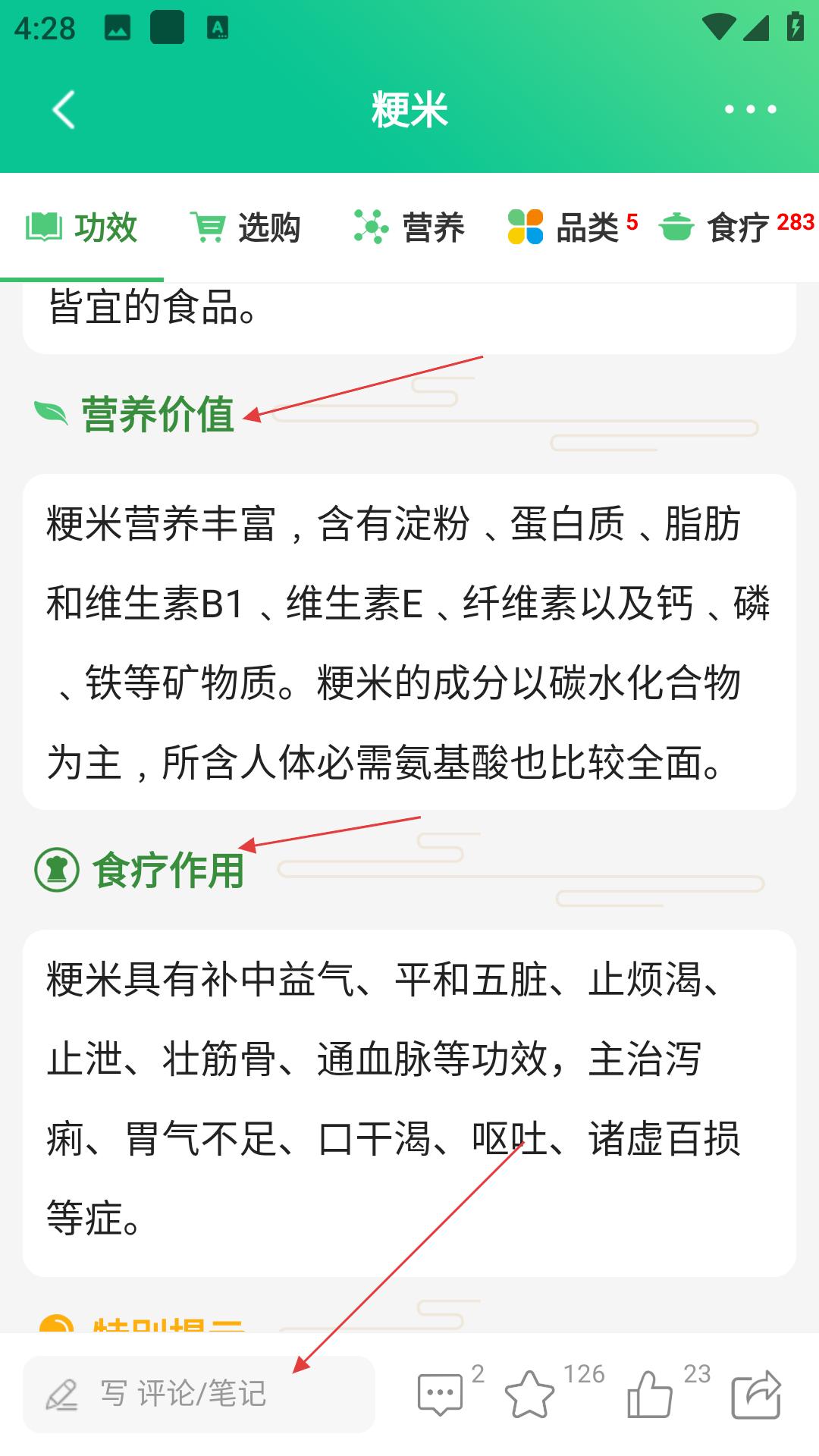 4、在粳米詳情頁,可查看其營養價值和食療作用,還能進行寫評論、筆記等互動操作。