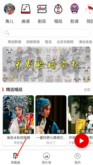 1、首頁,有角兒、曲譜等分類入口,展示京劇臉譜賞析和梅派、程派精選唱段,底部京劇迷導航欄聚合京劇內容。