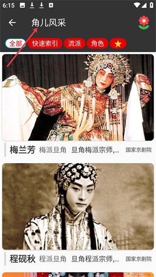 2、角兒風采頁,展示梅蘭芳、程硯秋等京劇名家,可按流派、角色篩選,呈現大師藝術形象與流派特色。