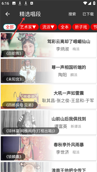 3、精選唱段頁,有白蛇傳、鎖麟囊等經典劇目唱段,可按藝術家、流派篩選,匯聚多流派京劇名段資源。