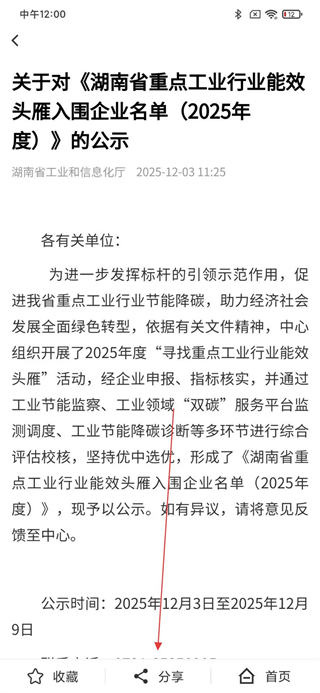 3、在資訊詳情頁閱讀內容了解相關公示信息,找到頁面底部的分享按鈕,點擊該按鈕,彈出分享選項菜單準備進行分享。