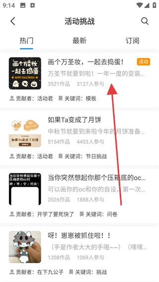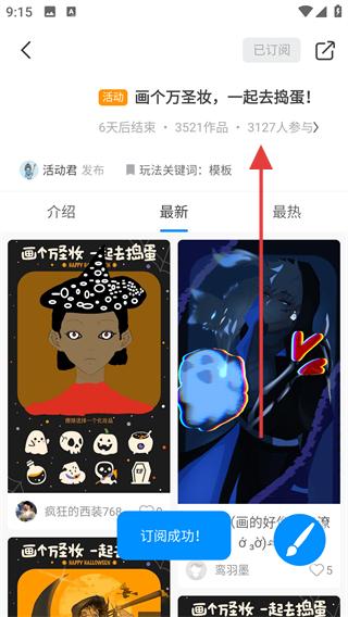 4、訂閱成功后在活動詳情頁查看最新參與作品,了解其他用戶的創作內容,激發自身的創作靈感,準備參與活動創作。