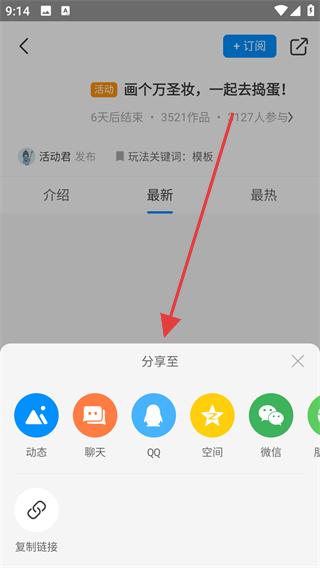 2、在活動詳情頁點擊分享按鈕,選擇動態、聊天、QQ等分享渠道,將活動分享給他人,邀請參與活動。