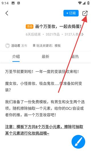 1、進入軟件活動挑戰頁面,瀏覽熱門、最新、訂閱分類下的活動,選擇畫個萬圣妝,一起去搗蛋活動,進入活動詳情頁。