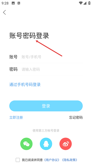 1、進入后先看到賬號密碼登錄界面,可輸入賬號密碼登錄,也能選擇通過手機號碼登錄,還有立即注冊忘記密碼選項,支持微信QQ微博等第三方賬號登錄。