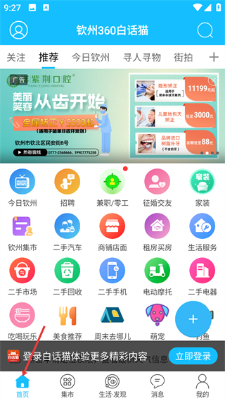 2、進入首頁看到欽州360白話貓標題,有關注推薦今日欽州等分類,還有招聘兼職等功能入口,底部有首頁集市等導航欄,可體驗更多精彩內容。