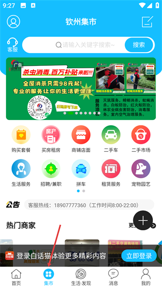 3、進入集市頁看到欽州集市標題,有搜索欄可輸入關鍵字搜索,還有購買套餐買房租房等功能入口,底部導航欄可切換頁面體驗更多服務。