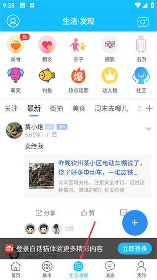 4、進入生活發現頁看到美食相親等分類,有最新內容展示,可進行分享點贊互動,底部導航欄可切換到首頁集市等其他頁面繼續體驗。