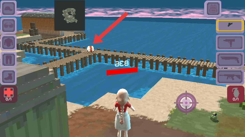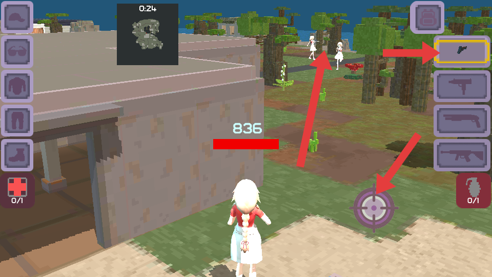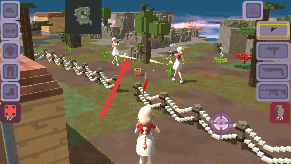 2、在像素風格的場景里,右側有不同槍械可供選擇,選好槍械后,瞄準遠處目標,點擊射擊按鈕進行攻擊。