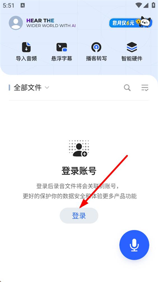 1、進入訊飛聽見界面,可見導入音頻等功能選項,提示登錄賬號,登錄后錄音文件會關聯賬號,可保護數據安全并體驗更多功能,點擊登錄按鈕進入登錄流程。