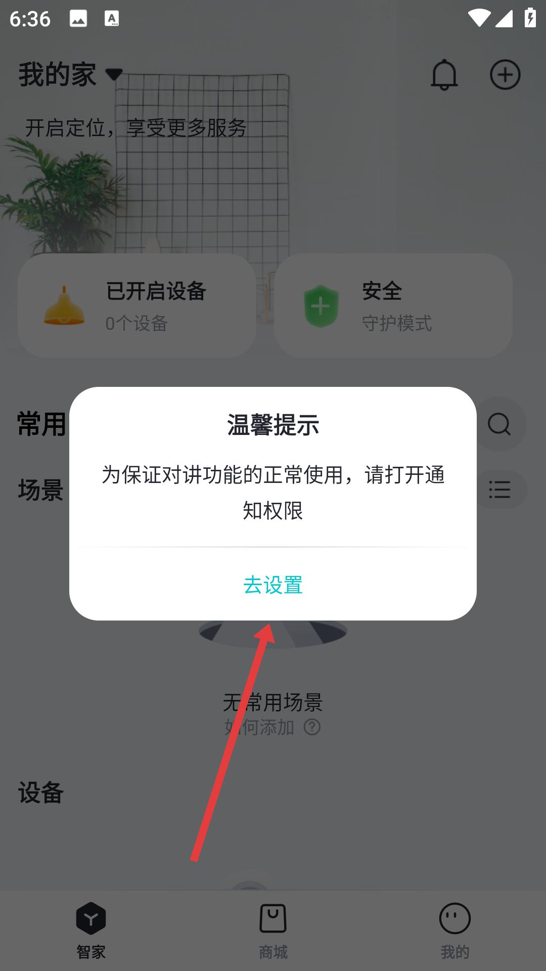 3、進入我的家頁面,有已開啟設備、安全守護模式等板塊,常用場景顯示無常用場景,還可切換智家、商城、我的等功能區。