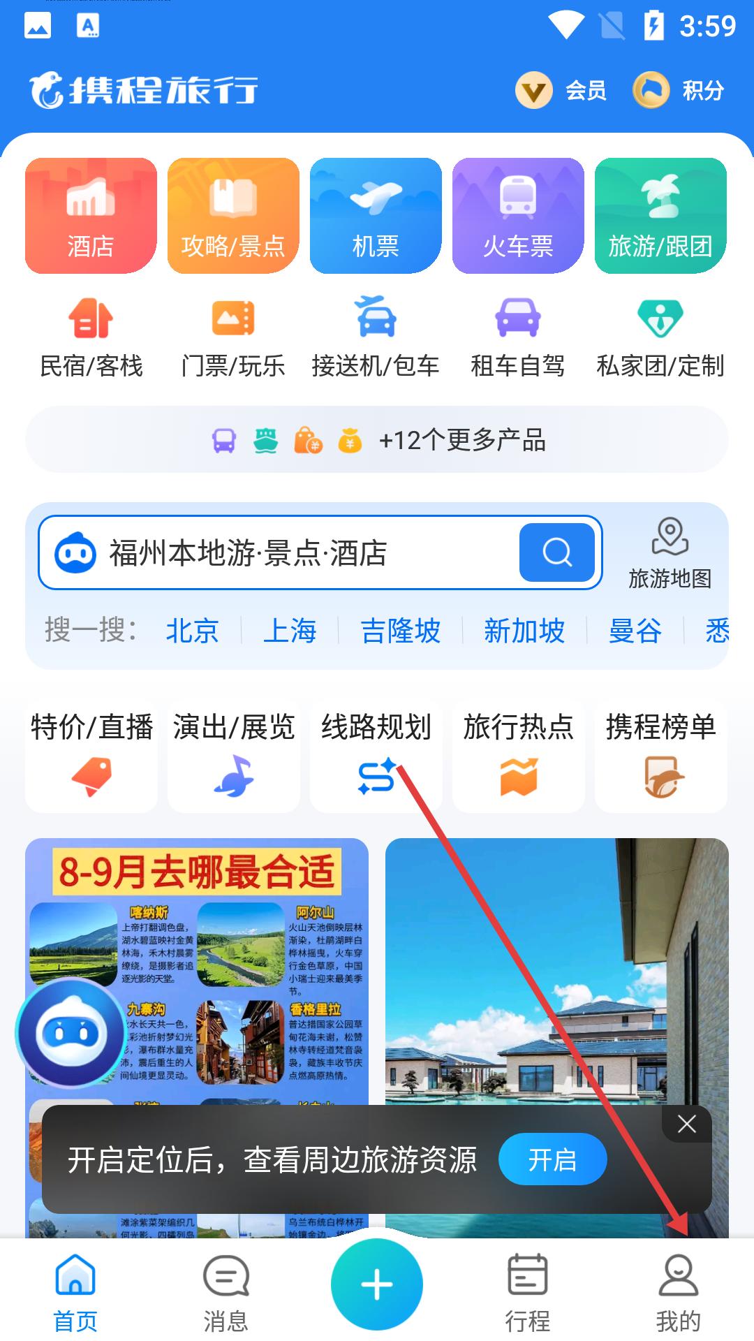 1、攜程首頁有酒店、機票等豐富功能入口,可搜索福州本地游,還有線路規劃等服務,底部有首頁、消息等功能欄方便操作,點擊右下角的我的。