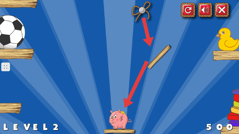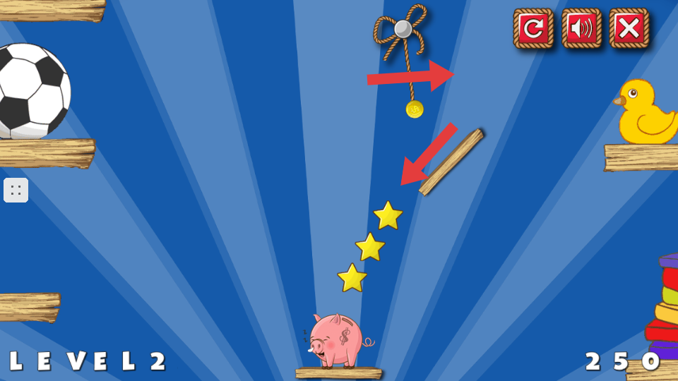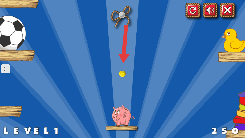 2、隨著關卡推進,會出現木板等障礙物,要通過割斷繩子和利用木板,引導金幣朝著存錢罐的方向掉落。