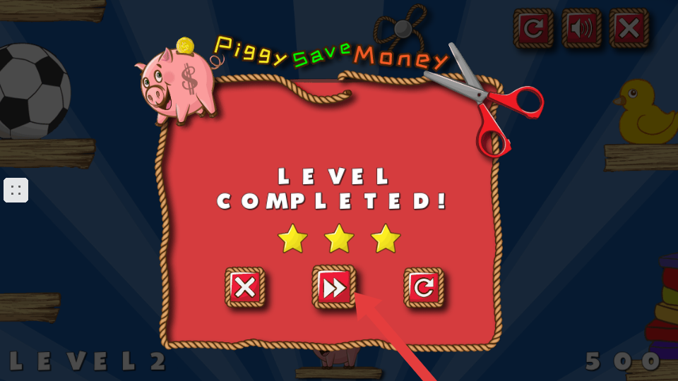4、當成功讓金幣落入存錢罐,完成關卡任務后,會顯示通過關卡的界面,此時可點擊箭頭按鈕進入下一關。