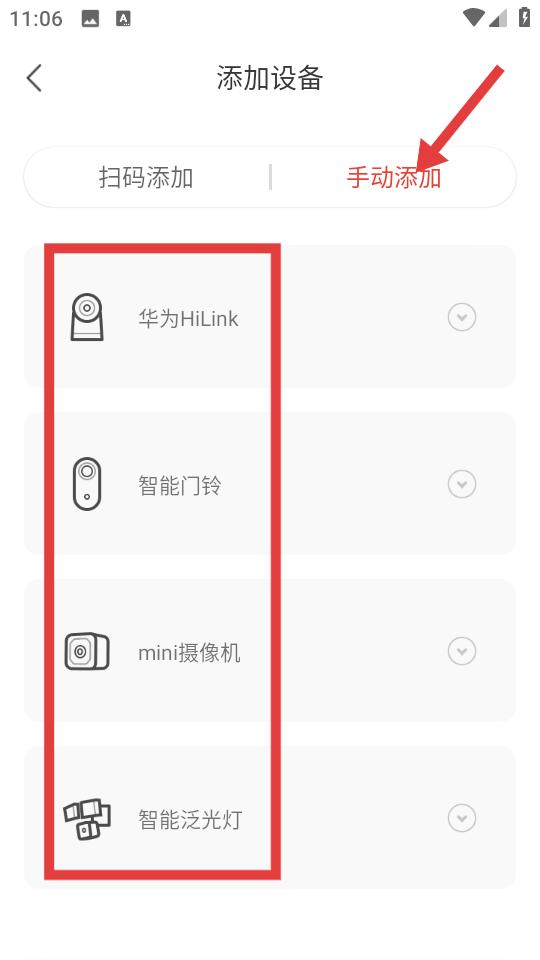 1、設備頁點添加設備,進入含掃碼、手動添加的頁面,手動列表有華為HiLink、mini攝像機等類型,按需選即可推進添加。