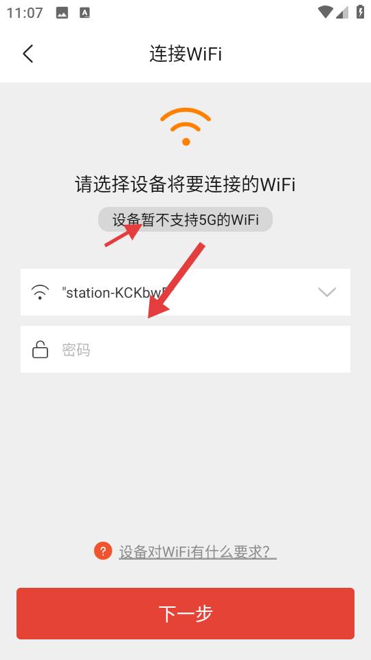 3、添加設備后到連接WiFi頁,設備不支持5G,輸密碼點下一步,完成配置讓設備接入網絡,實現遠程管理。