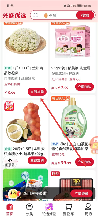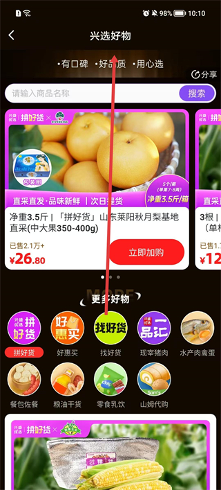 4、點擊興選好物板塊進入好物頁面,可看到拼好貨、好惠買等分類,選擇感興趣的商品,如山東萊陽秋月梨,點擊立即加購,完成商品選購。