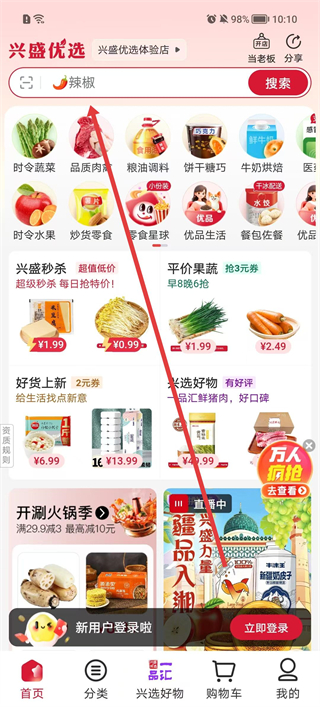 1、打開興盛優選APP,進入首頁可看到搜索框和各類商品分類入口,在搜索框輸入商品關鍵詞,如辣椒,點擊搜索,查看搜索結果。