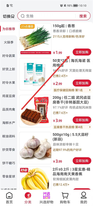 3、若想查看更多商品分類進入分類頁面,選擇具體分類,如時令蔬菜,查看該分類下的商品列表,選擇商品點擊立即加購。