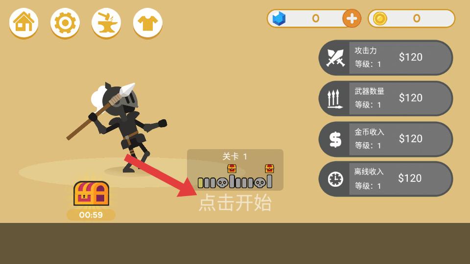 2、在角色界面,可看到攻擊力,武器數量等屬性,點擊點擊開始,進入關卡1,開啟戰斗。