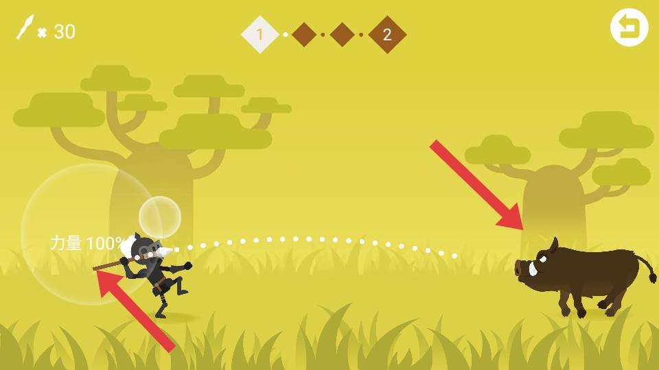 3、戰斗時,操控角色,蓄力到力量100后,向野豬等敵人發起攻擊,精準命中敵人來擊敗它們。