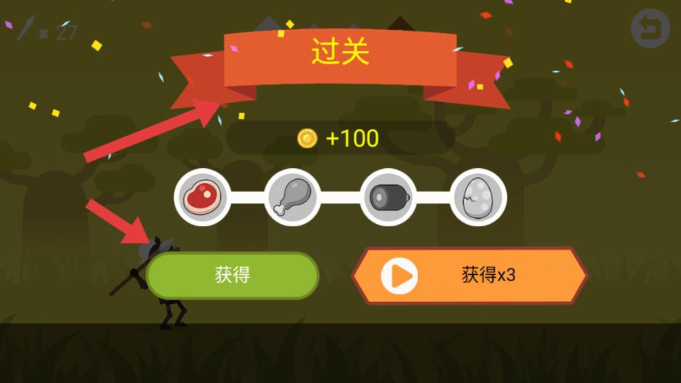 4、成功擊敗敵人后,會顯示過關,獲得金幣和道具獎勵,點擊獲得領取獎勵,也可選擇來獲取更多獎勵。