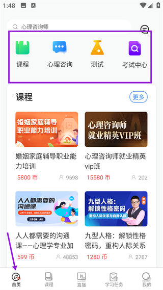 1、進入平臺首頁,可看到課程、心理咨詢等功能入口,還有婚姻家庭輔導等推薦課程,點擊課程板塊相關內容,即可進入專業課頁面。