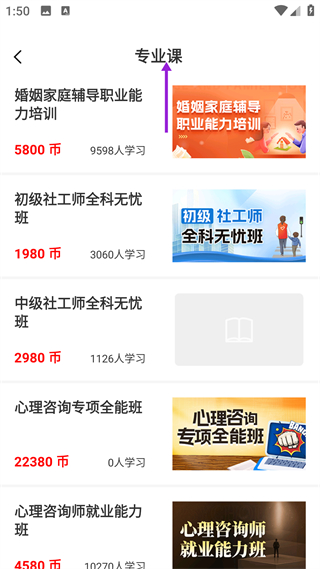 2、進入專業課頁面,能查看婚姻家庭輔導、社工師培訓等各類課程,每個課程標注所需幣值與學習人數,選擇對應課程進入詳情頁。