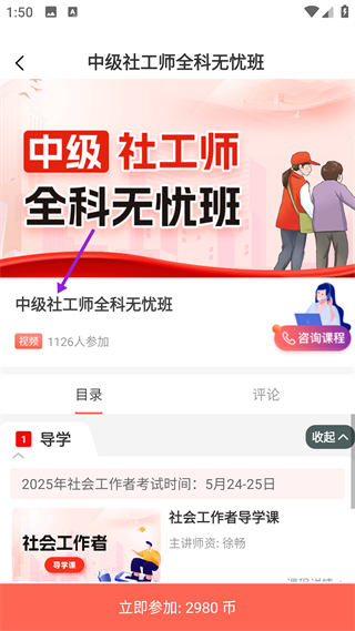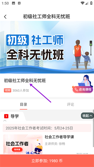 3、進入初級社工師全科無憂班詳情頁,查看課程介紹、目錄等內容,了解課程安排,點擊立即參加按鈕,即可用對應幣值參與課程學習。
