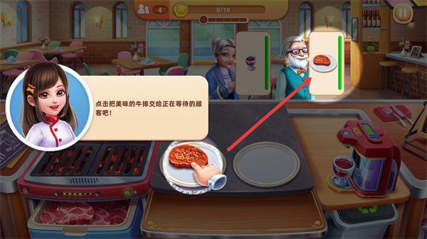 2、牛排烤好后,點擊牛排,把美味的牛排交給正在等待的顧客,滿足顧客的用餐需求。