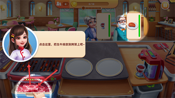 1、烹飪時點擊生牛排,把它放到烤架上,開始烤制牛排,為后續給顧客提供美食做準備。
