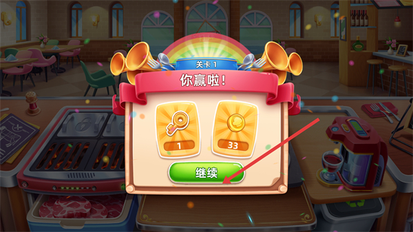 4、成功完成關卡任務后,會顯示你贏啦的界面,還能獲得鑰匙和金幣獎勵,點擊繼續,開啟下一關。