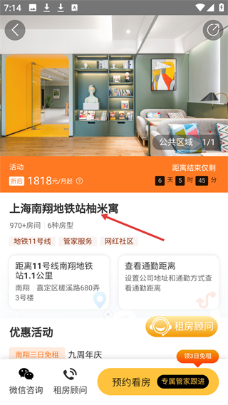 3、上海南翔地鐵站房源頁,折后1818元月起,近地鐵11號線,970房間6種房型,有管家服務,可預約看房領免租。