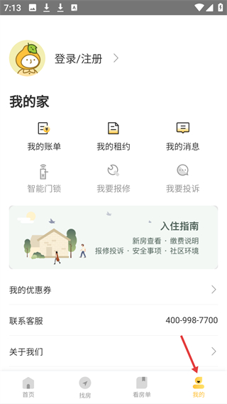 4、我的頁可登錄查看賬單、租約等,有智能門鎖、報修投訴功能,還能看入住指南,聯系客服。