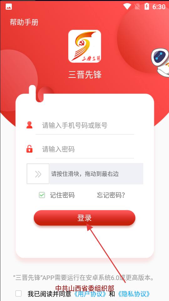 2、進入登錄界面輸入手機號碼或賬號、密碼,點擊登錄按鈕即可完成登錄,若忘記密碼可點擊忘記密碼,按提示由支部管理員重置或自行操作重新設置。