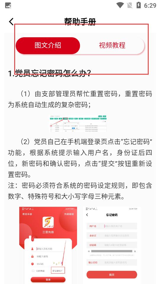 3、若登錄遇問題進入幫助手冊,這里有圖文介紹、視頻教程,像黨員忘記密碼可按指引,找支部管理員重置,依教程操作解決登錄難題,助力成功登錄客戶端。
